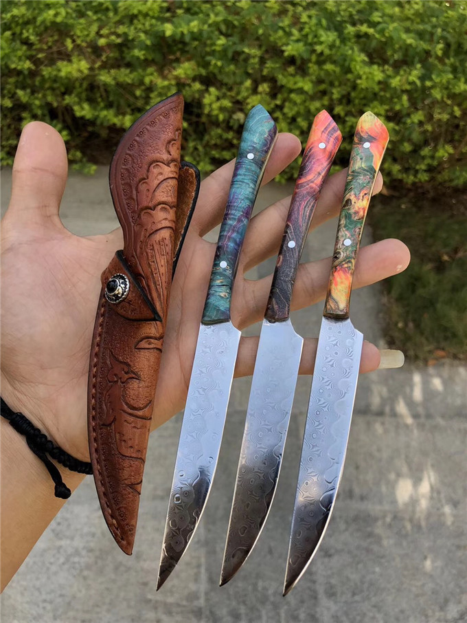 全长:21cm、刃长:10cm、手柄:11cm、刃宽:2.2cm、厚度:2mm、钢材:进口锻造大马士革钢,硬度:60HRC,包装:手工黄色盒