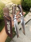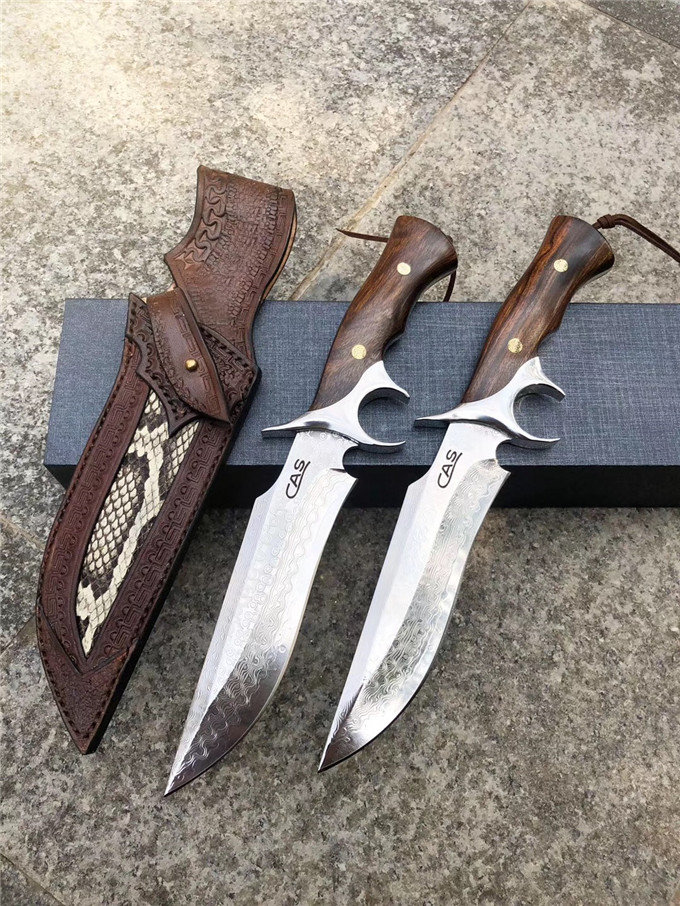 参数:总长:26.5cm,刃长:14cm,刃厚:3.5mm,刃宽:3.5cm,钢材:进口锻造大马士革钢VG10,85层锻造!真空热处理,硬度:60-61HRC,手柄:一体钢头护手+进口美国沙铁木,皮套包装:进口意大利植鞣皮手工刀套+手工黑色盒包装