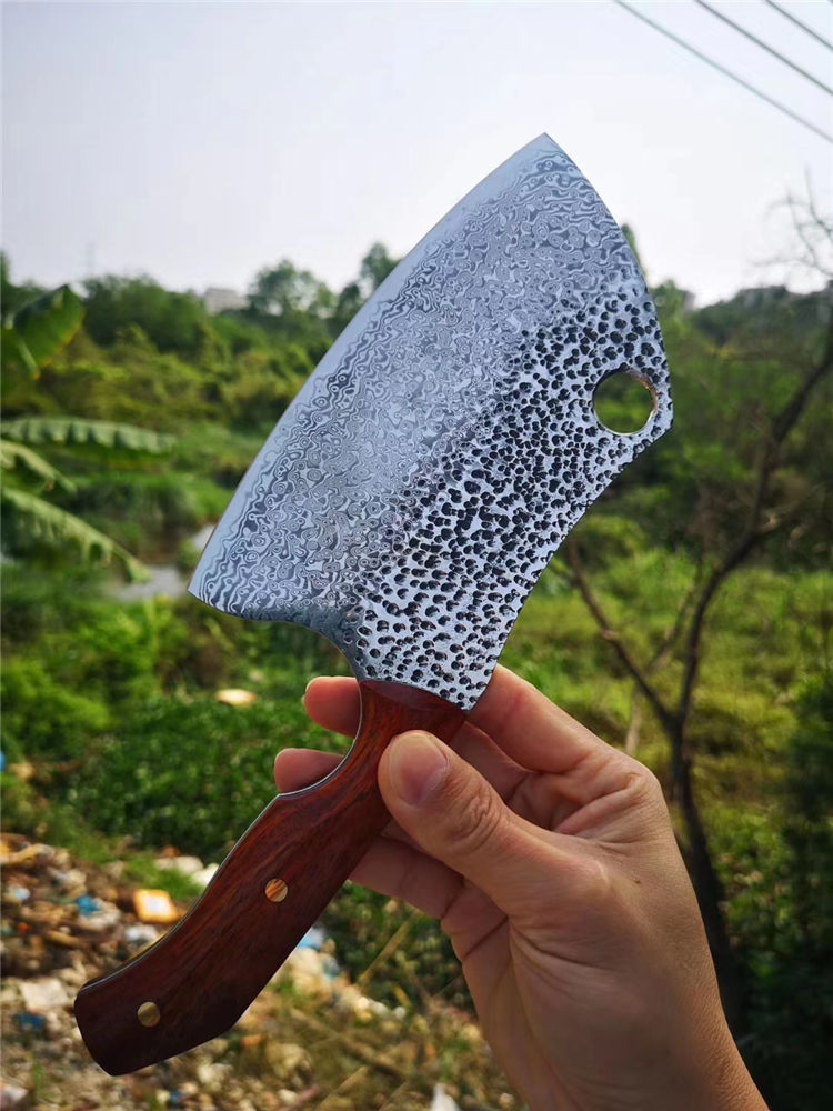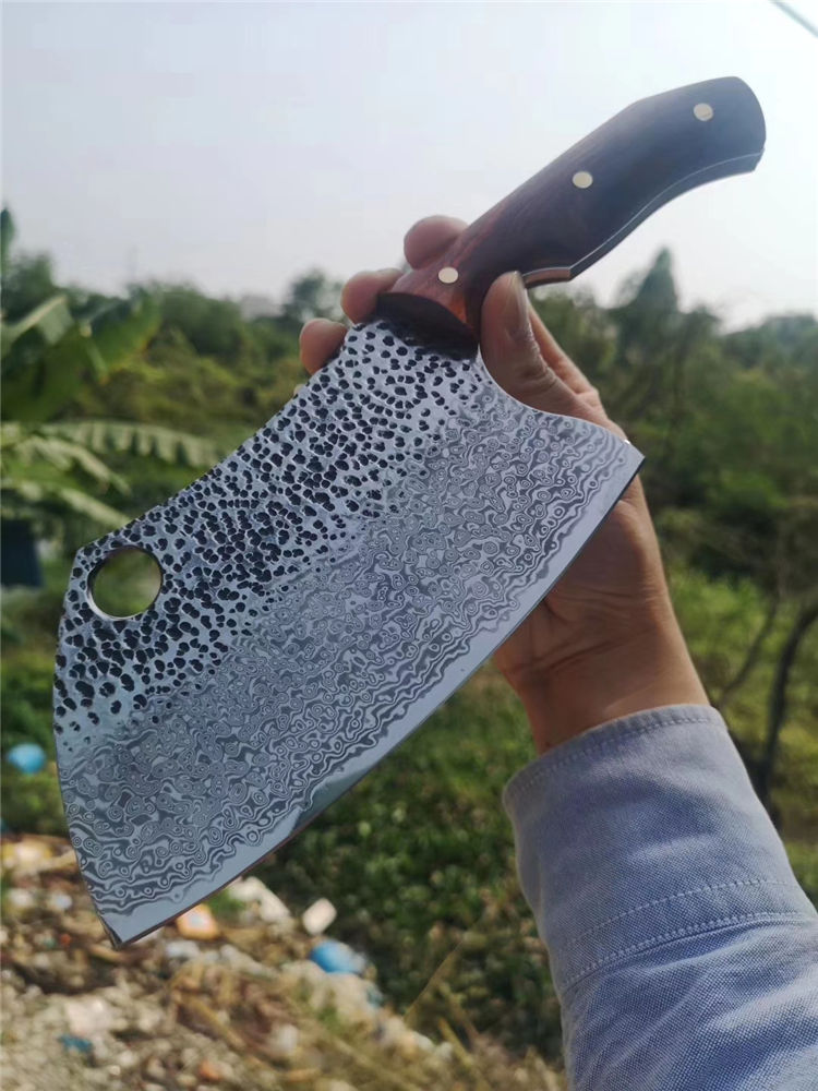 日本进口VG10钢芯锻造大马士革钢97层,真空深冷油淬热处理,锋利度级别:国际一级锋利标准,食品级安全检查,柄材;进口黄檀木嵌片,三颗黄铜铆钉固定