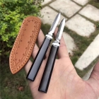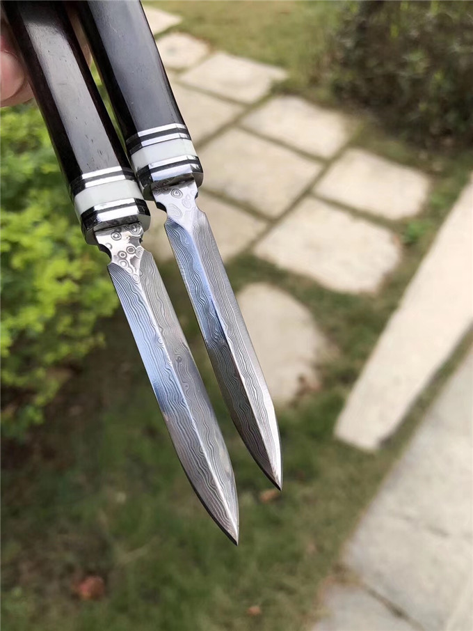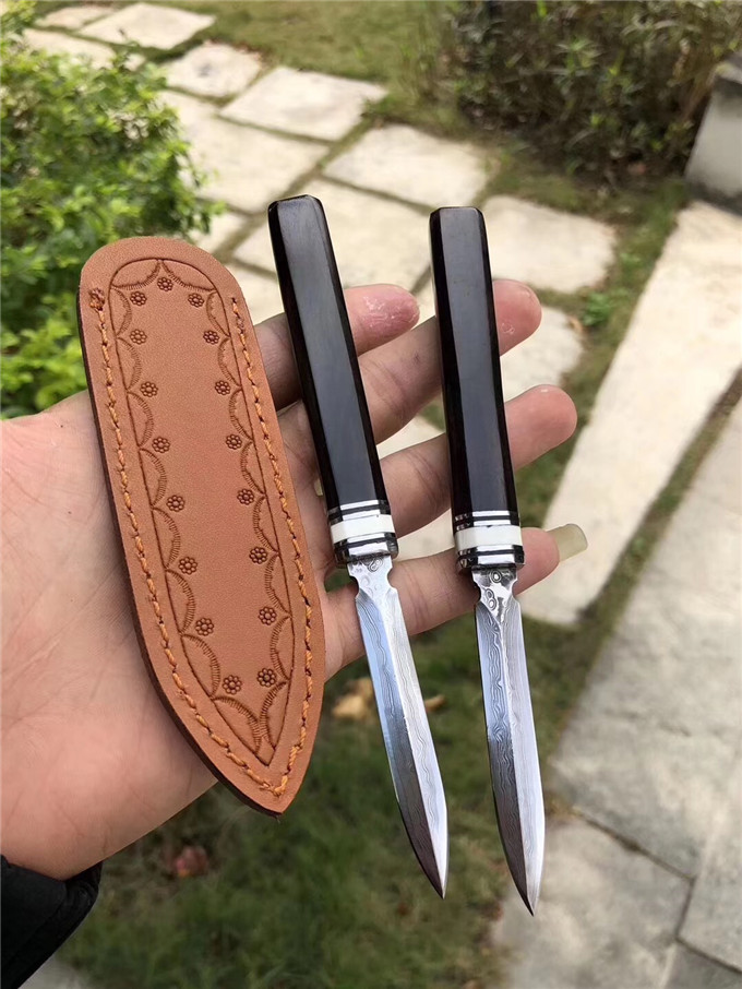 锻造大马士革钢搭配手柄牛骨+黑檀木,纯手工打磨而成八角(八方聚财)形状。皮套包装:雕花茶皮套+手工礼盒装,全长:16.5cm,ren长:7cm、柄长9.5cm、厚度:3mm、宽:1cm,钢材:大马士革钢、硬度:59HRC