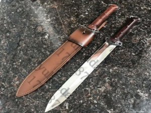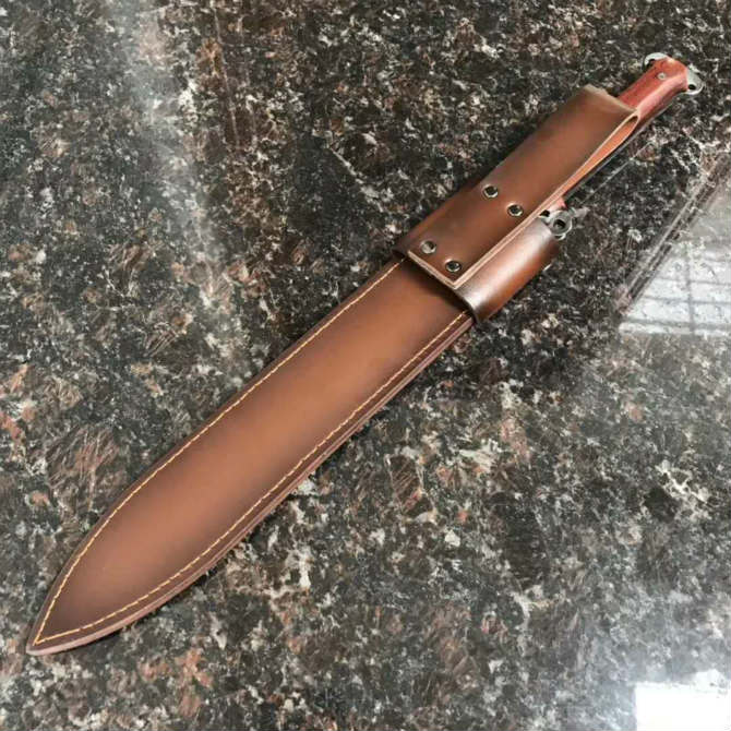总长:47.2cm、ren长:31cm、柄长:15cm、厚度:5.2MM、钢材:高速钢、真空热处理、硬度:61HRC、手柄材质:进口红酸枝木,搭配手工牛皮套