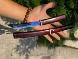出口日本原单尾货,数量不到60把!手快有!高端进口星云马赛克大马士革钢,硬度60-61HRC,钢材特点:不同光线下的丰富变化,使其如同浩瀚星空中的点点繁星,绚丽而多彩,柄部取材搭配进口大叶紫檀木,整木一开二作为手柄以及刀鞘、每条木材纹路都是独一无二,非常油腻高档,由国内老师傅纯手工研磨抛光完成!是一款非常值得收藏极品武士刀款!由于货量有限,喜欢的朋友们不要错过。