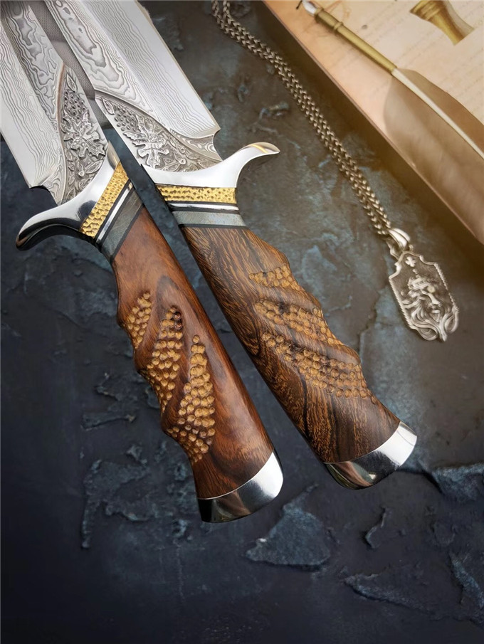 全长:27.5CM、刃长:14CM、手柄:13.5CM、刃宽:3.2CM、厚度:5MM、刃钢材:进口锻造大马士革钢VG10,层数96层,高温真空热处理,硬度:60HRC,