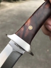 总长:23.5cm,刃长:11cm,刃宽:2.7cm,刃厚:5mm,钢材:日本进口VG10钢,结构:一体龙骨设计,手柄渐变磨薄减重设计!硬度:60-62HRC,热处理:专业真空深冷热处理,回火处理!重量:186g,柄材:进口微粒黄檀木+红G10片!马赛克花钉装饰。皮套:意大利手工优质雕花皮套手工雕花缝线!做旧复古颜色!手工着色!包装:手工盒子包装内衬EVA!如此好的一把刀!数量有限!看上朋友不要错过哦。