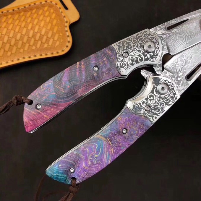 参数:全长:19.5cm、刃长:9.5cm、柄长:10.5cm、厚度:3.5mm,宽度2.3cm,钢材:进口日本大马士革钢,真空热处理,硬度:59-60HRC,手工开刃锋利无比,手柄:雕花唐草柳花钢头+进口稳定固化木,包装:黑色手工小盒。