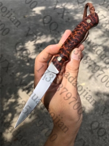 总长:20.5cm,刃长:9cm,刃厚:2.5mm,刃宽:1.8cm,重量:75g,钢材:奥地利进口M390粉末钢,正品保证,支持官方光谱测试检测,假一赔十,热处理:上海专业真空热处理,硬度:60-61HRC,表面处理:砂光效果,柄材:名贵高端进口蛇纹木+红G10贴片,马赛克花钉固定!一体龙骨结构M390粉末钢!皮套:意大利进口植鞣皮大师级手工缝线雕花制作,效果非常好,包装:手工盒子包装!