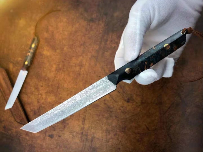 一体龙骨结构大马士革钢制作!超级耐磨耐腐蚀,钢材韧性与防锈性保持度非常好,高温真空热处理,成品硬度60-61HRC,表面保留原缎自然纹理,手柄搭配//进口稳定固化木,星幻火焰/瑰丽绚烂,充满了神秘的浪漫色彩。【皮套:进口手工复古雕花̇牛皮套、扣带式】总长:21.5cm、刃长:11cm、手柄:10.5cm、钢厚度:3.2mm、宽度:1.8cm、钢材:进口锻造一体龙骨大马士革钢,硬度:60-61HRC、手柄:稳定固化木材+马赛克柳丁、包装̇:手工盒