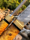 全长:22cm、刃长:10.2cm、手柄:11.8cm、厚度:3.5mm、刃宽:2.9cm、钢材:进口锻造大马士革钢,硬度:60HRC,热处理:高温真空热处理、开刃方式:纯手工三道研磨,手柄材料:纯黄铜镶嵌+进口金丝楠木,皮套:意大利进口植鞣革皮手工雕花缝线刀套!经典怀旧气息!包装:手工黑色盒装