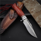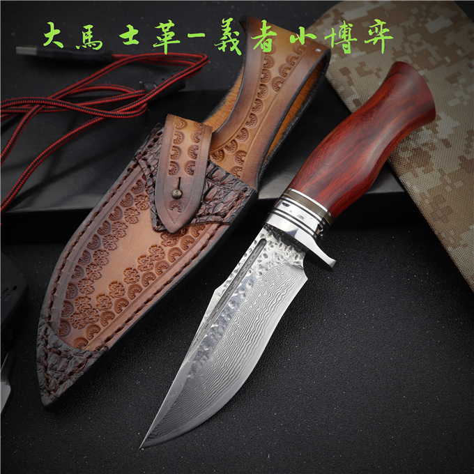 刃材:大马士革钢VG10:刀柄:钢头+花牛角+进口科檀木/总长230MM,刃长:110MM,刃厚:4MM,刃宽:34MM,硬度:60HRC,热处理技术:真空热处理,表面效果:电脑数控水磨,砂光效果,护手:430不锈钢电脑CNC,。皮套:意大利进口手工雕花手工缝线植鞣皮,复古经典怀旧效果。开刃方式:水冷二次开刃,以锋利度为主。