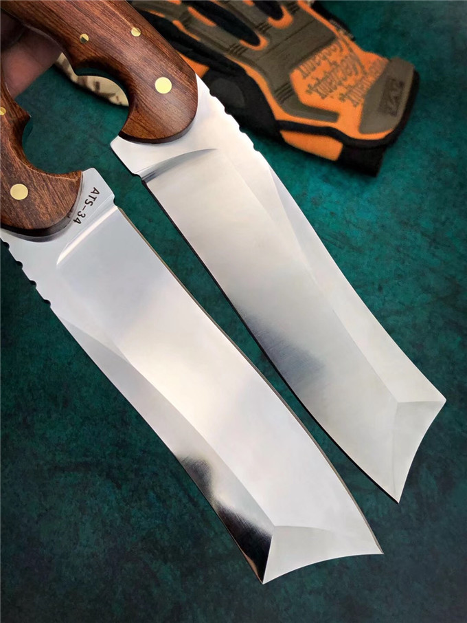 长:15cm、手柄:13.5cm、刃宽:4CM、刃厚度:5MM、钢材:进口ATS-34一体钢、硬度:61HRC、真空高温深冷热处理、手柄材质:花梨木、皮套:手工牛皮刀套