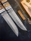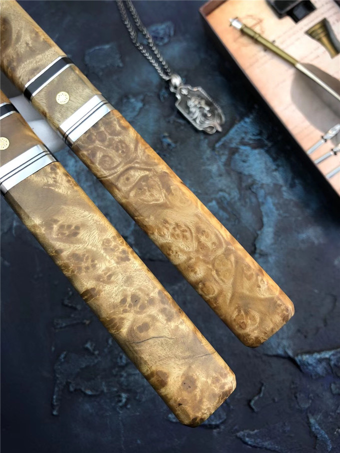 总长:22.5cm、刃长:12cm、柄长:10cm、刀刃宽:2.5cm、厚度:3.5mm、刃钢材:进口大马士革VG10钢,硬度:60HRC。高温真空热处理,手柄以及刀鞘材质:不锈钢头+天然白影榴木+黑檀木隔片+梅花铆钉!