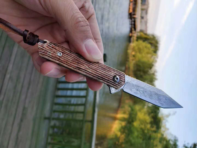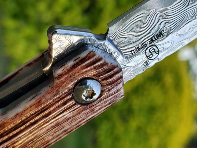 刀刃选用3毫米71层日本VG10刃钢大马士革锻打祥云纹,镜光工艺刀刃、花纹清晰自然,刀刃锋利可剃汗毛,刀柄精选骆驼骨雕刻老树皮复古工艺,经千目砂纸打磨抛光,主轴镶嵌2片高精度陶瓷滚珠轴承,一体快开设计,配意大利进口植鞣皮手工缝制皮套,可盘玩,复古礼盒包装,赠送简师傅收藏证书。【骆驼骨小魔方】全长13.9CM,刃长6.2CM,刃宽1.5CM,刃厚3.0MM,硬度60HRC。简师傅作品终身免费保养维护