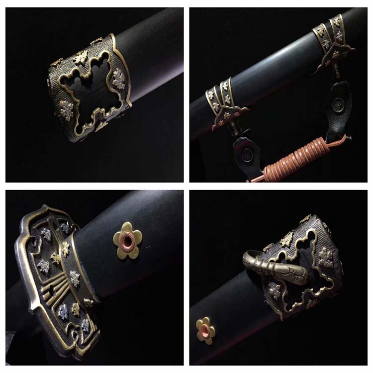 全铜装黑檀研磨太刀(尺寸):全长103cm、刃长73cm、刃宽3.2cm,厚0.80cm、全重1.90kg,净重1.48kg,鞘材:正宗黑檀鞘全铜装具,材质:百炼花纹钢覆土烧刃十三道研磨,正品,优惠,镇宅,收藏,赠品:精美锦盒、保养油、刀布