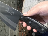 厚度达到3.8mm,比普通菜刀要厚,所以这刀是非常结实的,采用钢材8CR18,具有很高的抗硬性和耐磨性。抗弯强度高,韧性等性能非常好,硬度59HRC,日常生活中可以砍骨也可以切肉。锋利度非常好,手柄选取彩木制作,有很好的防滑性和防腐性,全部用好料按照出口高品质要求出货,细节做得很好,完工度与吻合度非常好,性价比非常高!买到就是赚到