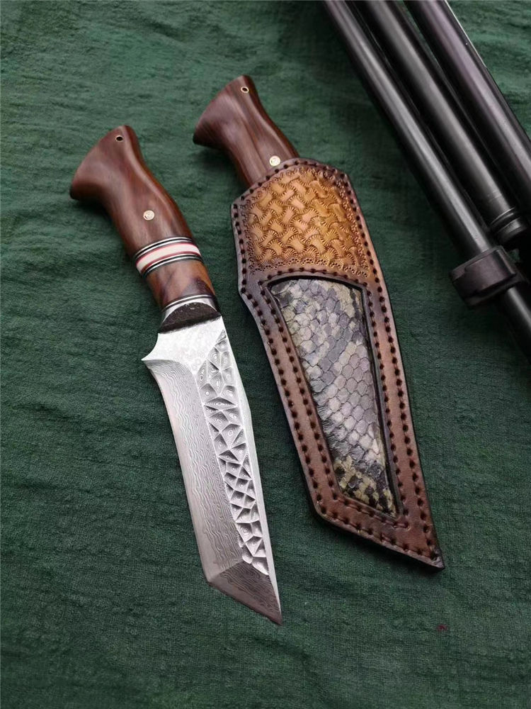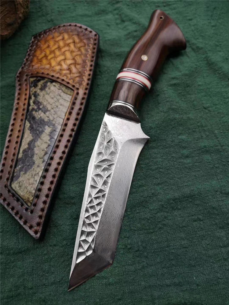 进口VG10芯67层大马士革钢,锋利度与手感超好!造型狂野大气,刃材锋利度保持性较好.手工作精品猎刀