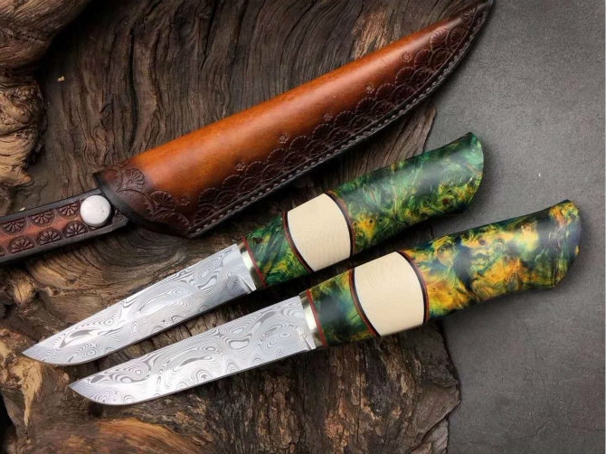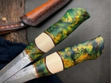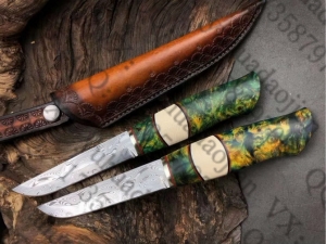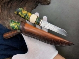 全长:21.5cm、刃长:10cm、刃宽:2.2cm、厚度:3MM、钢材:进口瑞粉大马士革钢【大玫瑰纹】、硬度:60HRC、手柄材料:纯黄铜+仿牙料+稳定固化木,皮套:意大利植鞣皮手工雕花缝线刀套