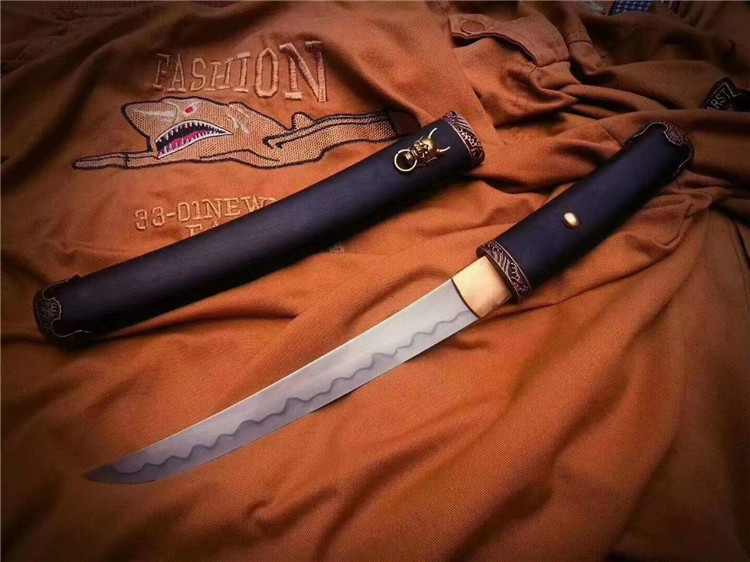 cm ,刀身材料为T10锻造,古法覆土烧刃,高性能,手工研磨,鞘为进口非洲一级乌木人工制作染色,刀柄镶嵌球形纯铜铆钉,,手雕配饰,刀鞘镶嵌手工雕刻纯铜日本传统鬼怪般若,非常锋利,居家把玩收藏佳品。
