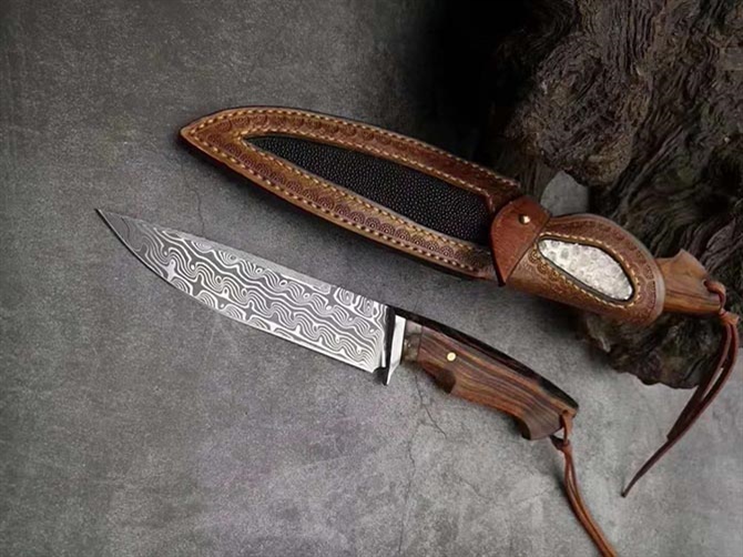 总长:25.5,cm,刃长:13.0cm,刃厚:3.5mm,刃宽:3.1cm,净重:约135克,钢材:108层进口锻造大马士革钢,热处理:专业真空深冷热处理,性能强悍,硬度:60HRC,柄材:美国沙漠铁木,皮套:意大利优质进口植鞣皮镶嵌珍珠鱼皮和蛇皮,手工缝线!复古怀旧棕色!包装:复古手工盒子!