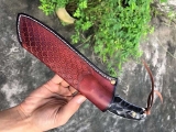 总长:26cm、刃长:14cm、手柄:11cm、钢厚度:4MM、钢材:一体大马士革钢,硬度:60HRC、真空热处理,手工二次开刃,手柄:黑檀木雕刻,皮套:进口植鞣皮手工雕花制作,包装:黑色手工盒
