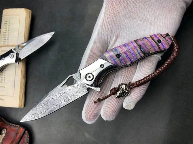 高端瑞粉火焰纹快开折刀,喜欢收藏高端系列的朋友不要错过!数量不多,售完停产(玲珑刀匠)纯手工完工制作,送礼珍藏极品,进口瑞粉大马士革钢(火焰纹),搭配猛犸齿材料制作,如梦幻一般!翡翠壁绿,内部结构陶瓷轴承滚珠,弹指瞬开非常不错的,皮套/进口意大利植鞣皮纯手工制作雕花缝线镶嵌蛇皮制作,做工细节极好,好东西值得您拥有!总长:17.8cm、折合长:10cm、刃长:7.3cm、刃厚度:3.1mm、刃宽度:2.6cm、钢材:进口瑞粉大马士革钢火焰纹,硬度:60-61HRC,真空热处理。开刃方式:二次开刃,手柄材质: 钢头+天然猛犸齿料制作,结构:陶瓷轴承滚珠,包装:骷髅吊装尾绳+手工黑小盒装+保养油1瓶。