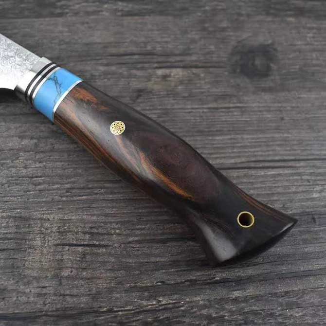 新品美图,【贪狼-黄檀木柄大马士革厨刀】家居高端厨房用刀!刃材采用优质大马士革钢锻造制作,刃面锻打水滴雨点纹理清晰美观;柄材精选天然黄檀木搭配人工绿松石,铜花铆钉加固,打磨圆润手感好,切菜切肉轻松自如,居家送礼必备佳品!