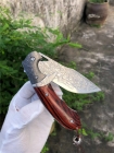 总长:22cm、刃长:9.9cm、柄长:12cm、刃厚度:3.5MM、刃宽度:3.1cm、刃钢材:大马士革VG10钢(83层)、硬度:60HRC、热处理方式:真快高温热处理,开刃方式:手工复次研磨,手柄材质:不锈钢头表面激花+大马士革钢片材料+微粒黄檀木,皮套:意大利手工雕花植糅皮,包装:黑色小盒+骷髅吊坠+手工皮套