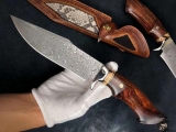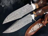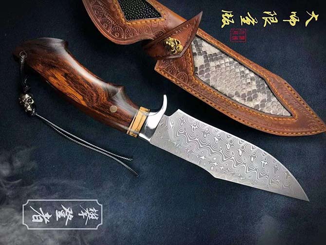 现货不多,制造成本居高,全部用稀贵材料,刃钢采用美国进口95层锻造大马士革钢,独特云眼花纹极其出色,而且刀背可见清晰锻造层次,经真空热多道工序处理,整刀真实硬度在60-61HRC,手柄搭配猛犸齿料+美国高密度沙滩木,每条木材精挑百里挑一制合,天然木纹每条独一无二效果,颜值超好,皮套意大利进口植鞣皮手工雕花镶嵌珍珠鱼皮+蛇皮材料制作刀套,
