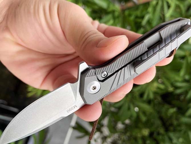 品质用料做工,锋利度与韧性保持度非常好,防锈性出色。高端配置采用TC4钛合金手柄喷砂灰色工艺制作,搭配奥地利进口M390粉末钢,硬度韧性超级出色,专业真空热处理真空深冷油淬,硬度在60-62HRC,钢材正品保证!韧性与硬度上都是比较优越的,在刀友圈子中被公认的一种高端刀具钢材、搭配钛合金背夹,一款给你实用方便携带的快开轴承折刀!