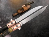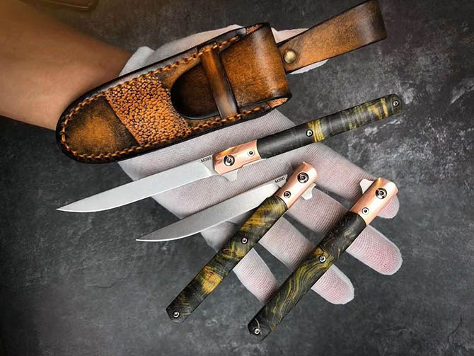 简约而且携带方便的笔刀,净重仅58克!手工制作版,内置轴承滚珠结构,开合只需弹指之间,刃材采用进口奥地利M390粉末钢【神钢】制作,在钢材排名中是比较高级的综合性能,无论是硬度与韧性的表现都非常出色,防锈性不用说是非常好的,钢材表面/石洗效果处理,上海专业真空深冷油淬热处理,真实硬度61HRC,手工开刃锋利度极好,剃汗毛,削竹木头完全不影响锋利度,搭配纯紫铜制配柄头+ 枫纹 固化稳定木,每把木材花纹都是独一无二的精品材料制作,皮套:阿根廷进口纯手工缝线雕花植鞣皮(携带式结构设计)。参数:总长22cm、刃长:9cm、刃宽:1.1cm、折合长:11.2cm、刃厚:2.5MM、钢材:奥地利进口M390粉末钢(神钢),硬度:61HRC,柄材:纯紫铜头+枫纹 固化稳定木材,重量:58克净重,包装皮套:阿根廷进口纯手工缝线雕花植鞣皮+手工黑色小盒装