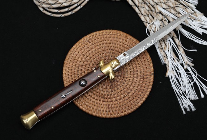 意大利黑手党使用的经典刀具-赌徒跳刀,在电影"教父"里出尽了风头!11英寸(28CM)蛇纹木柄的黑手党侧跳,出刀迅速,锁定稳固,具有超强的穿刺力!带有保险装置,刀护手处暗藏闭合开关,AKC公司出口产品,功能性完工度不错,满足把玩和收藏的需要