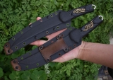 这款死神必杀采用了原美军海豹突击队教官威廉姆斯的外形专利。该刀型最早出现大约在300年之前,是日本短刀的恐造刀型为基础衍化而来。使用g10手柄。手柄设计为披着斗篷的死神手握巨蟒,口吐利刃,可谓形神兼备。黄铜雕刻铸造死神骷髅栩栩如生。无论您是收藏送礼还是实战均数上品。 全长30.5CM,刃长18.5CM,厚0.55CM,刃宽2.94CM,刀刃材料: 进口D2钢,,硬度:60(真空油冷热处理),刀套:战术K鞘。牛皮挂件。尖头单刀重量:267克(含刀鞘340),方头单刀重量:285克 (含刀鞘358)